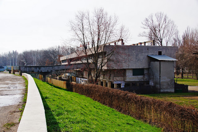 Az egykori Tisza Gyöngyét a Belvárosi híd felől közelítettük meg. Az egész épület le van zárva (néhány hónappal ezelőtt még be lehetett volna osonni, de lecserélték a zárakat), a hajléktalanokra a szag viszont még élénken emlékeztet. Több helyen ki van plakátolva, hogy a helyet őrzik. Szemben a Napfényfürdő Aquapolis elég élénk kontrasztot ad. Innen mentünk tovább a Bertalan híd felé. A parton az üdülőövezet szinte a Balatonra emlékeztet. A végén láttunk egy fura tornyos épületet, mintha világítótorony lenne, az épület egyik fele romos, a másikat felújították, valakik mászkáltak is benne, így nem mentünk közelebb.