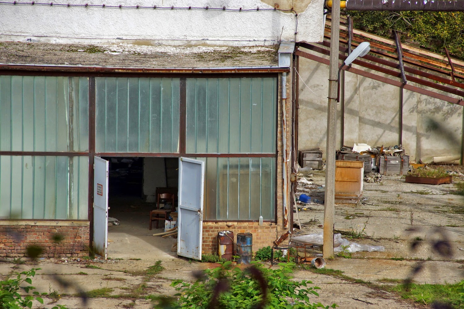 A gyár épülete körbe van kerítve, a közvetlen közelében házak vannak, csak a kerítésen kívül csináltam képeket. Annyi így is látszott, hogy nem sokat hagytak belőle néhány széken kívül, illetve egy targonca árválkodik az egyik épület mellett.